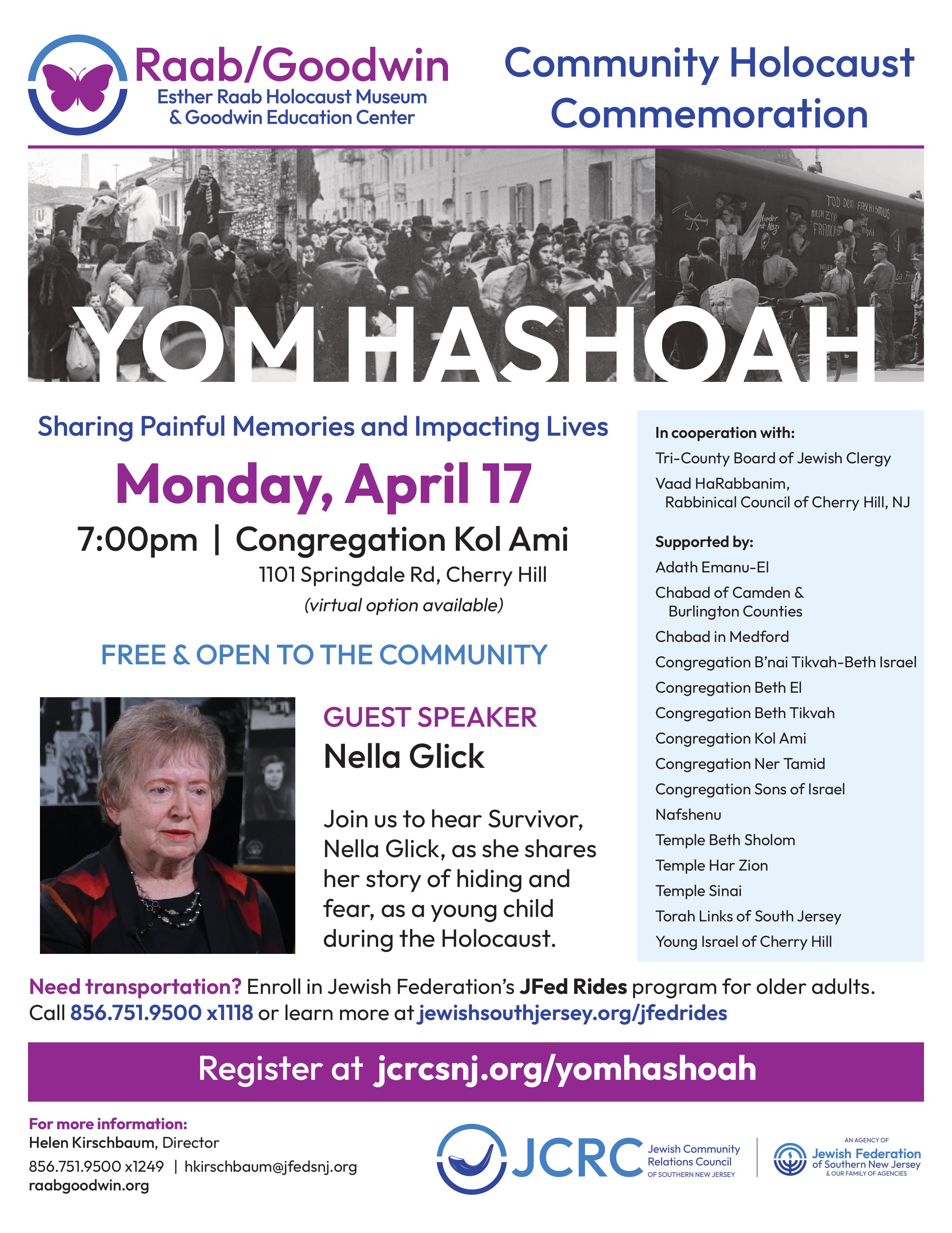 Join us on Monday, April 17, 2023 at 7:00pm, Congregation Kol Ami, to hear Survivor, Nella Glick, as she shares her story of hiding and fear, as a young child during the Holocaust. The event is Free and Open to the Community.
